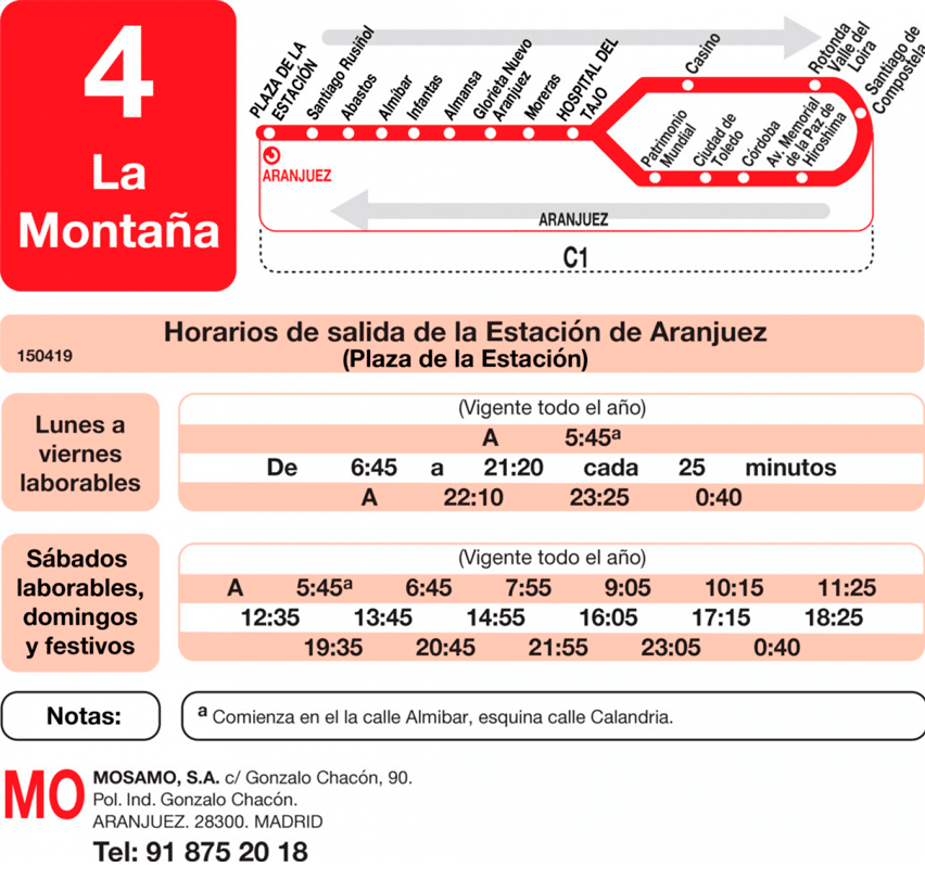 A continuación podrás encontrar los horarios de las diferentes líneas de autobuses que conectan el Barrio La Montaña, así como otros medios de transporte con origen y destino Aranjuez.